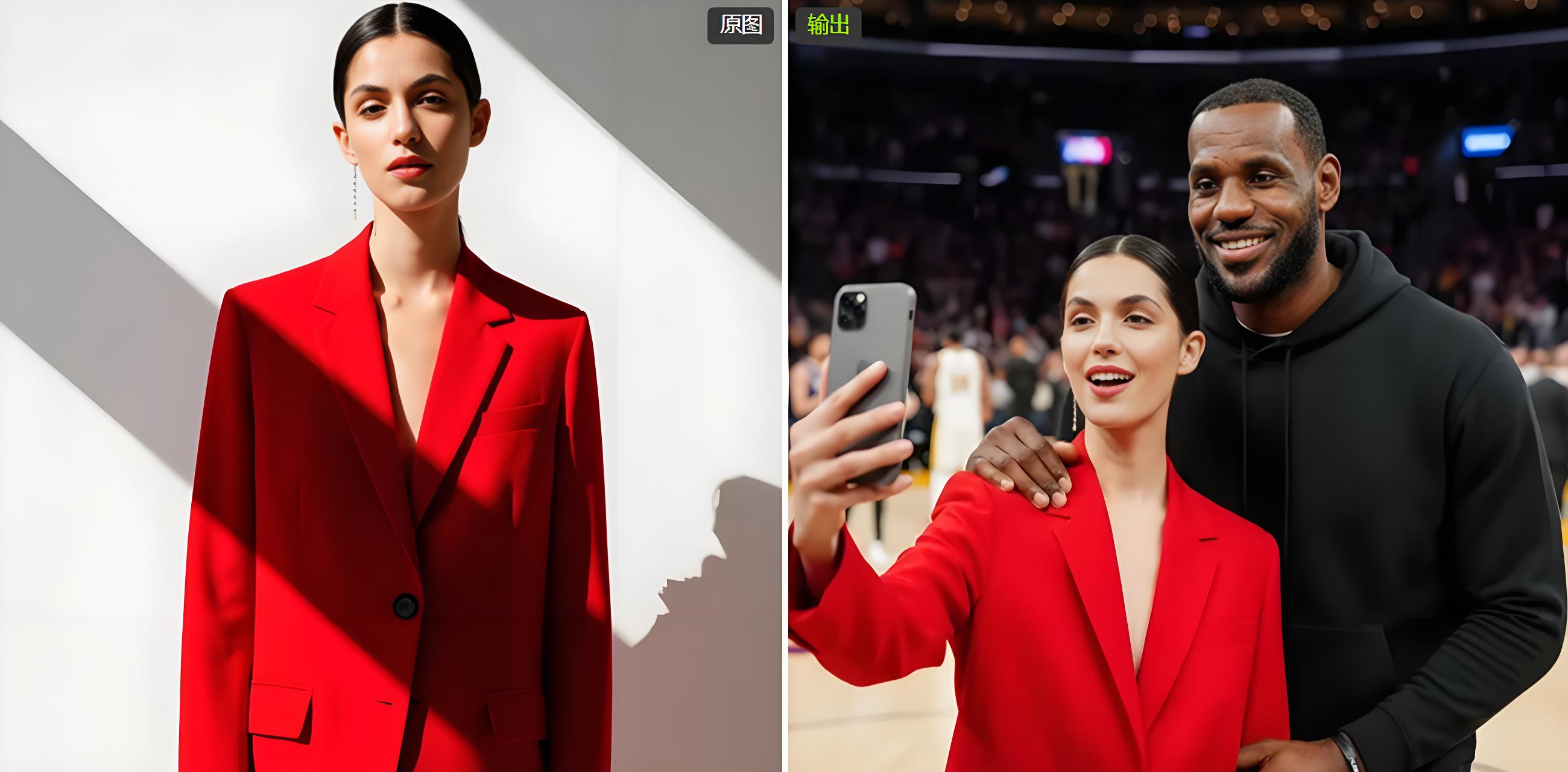 通过上传模特照片和衣服图片,一句话描述,让模特更换服装,一键生成试衣图